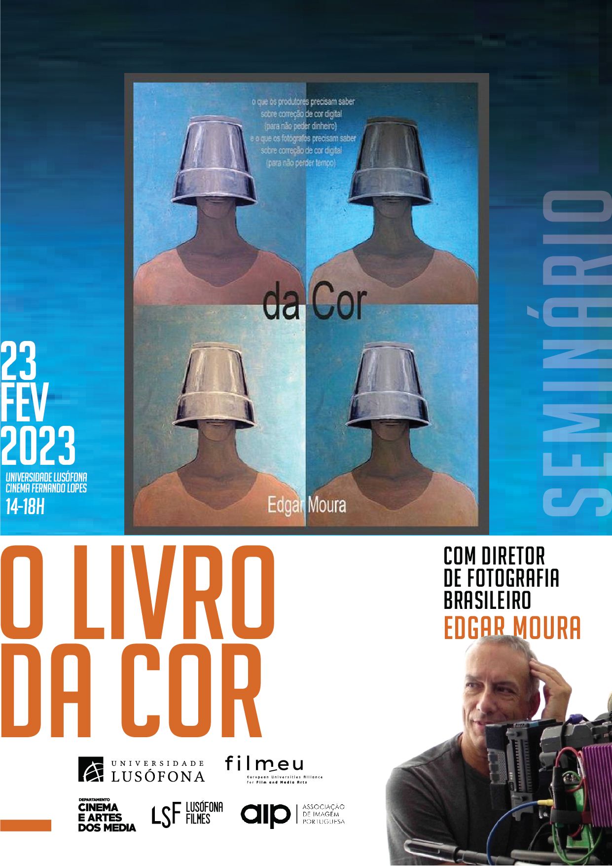 Edgar Moura na Lusófona a 23 de Fevereiro Na próxima semana, a tua Universidade recebe o diretor de fotografia brasileiro Edgar Moura para um seminário sobre "O Livro da Cor". Contamos contigo às 14h, no Cinema Fernando Lopes! Criado em 16 fevereiro 2023. Última atualização em 16 fevereiro 2023. Anterior Seguinte