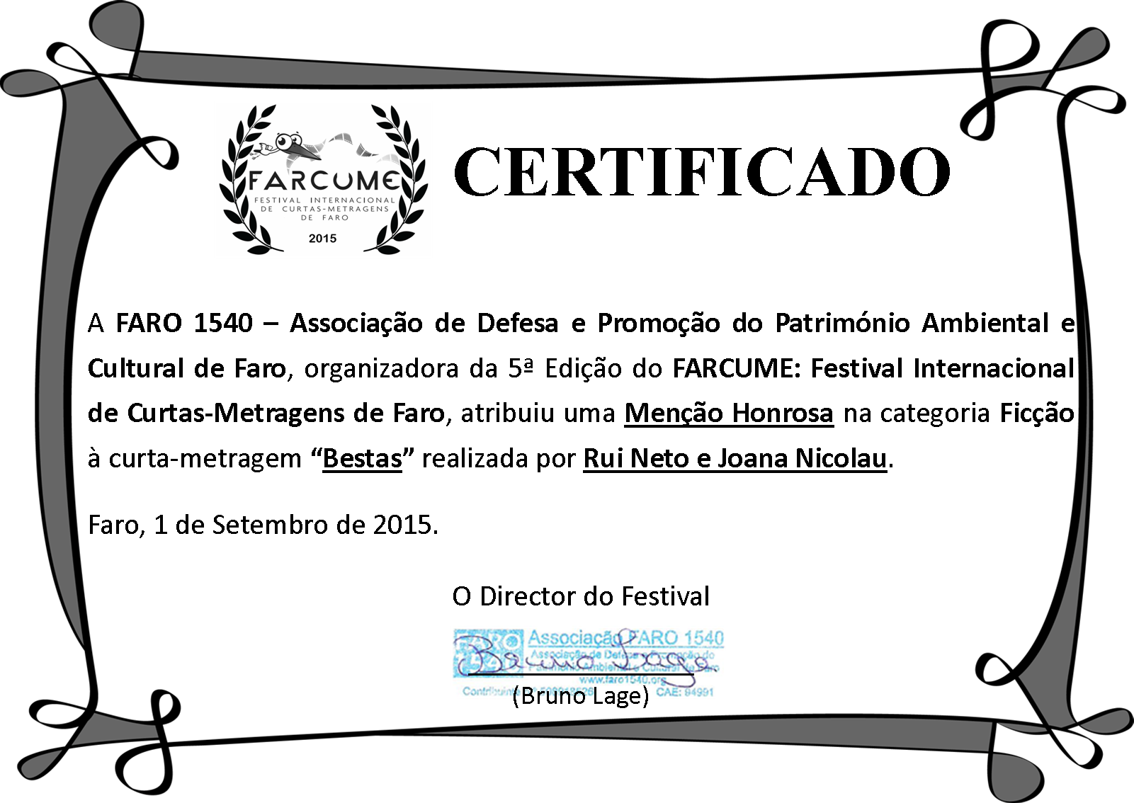 Bestas ganha Menção Honrosa no Farcume A Curta " Bestas" ganhou uma Menção Honrosa na categoria ficção no 5º FARCUME – Festival Internacional de Curtas-Metragens de Faro, que se realizou de 26 a 29 de Agosto em Faro (Portugal). Criado em 17 setembro 2015. Última atualização em 25 junho 2018. Anterior Seguinte